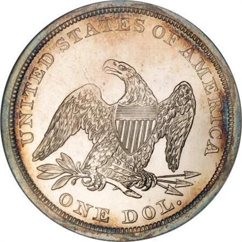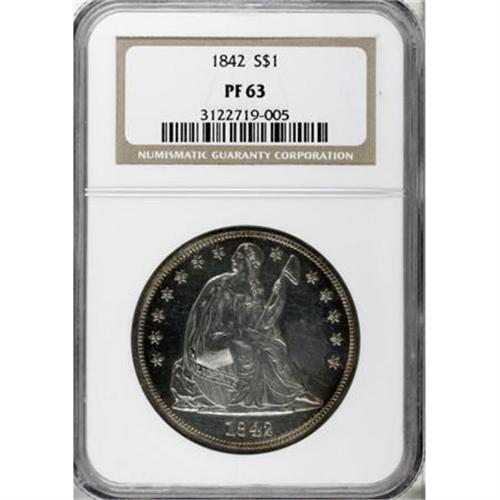 <B>1842 $1 PR63 NGC.</B></I> Beautifully toned in peripheral autumn-brown and cobalt-blue, as were so many silver dollars from the famous Amon Carter auction. The strike is slightly soft on the peak of the eagle's left (facing) wing, but remaining design details are sharp. A few wispy hairlines on the right obverse field are appropriate for the grade.<BR> Numismatist Duncan Lee published a study of proof Seated dollars in the August 2006 supplement to the Coin Dealer Newsletter. There, he listed the 1842 as the <I>second rarest </B></I>proof date of the series. We are able to trace only the following auction appearances of certified proofs:<BR><B><BR>1. PR65 NGC. </B></I>Norweb Collection, Part III (Bowers and Merena, 11/1988), lot 3780; Phil Kaufman Collection of Early Seated Proof Sets, offered elsewhere in the present sale.<BR><B><BR>2. PR63 NGC.</B></I> The present coin. Golden Jubilee Sale (B. Max Mehl, 5/1950), lot 812; Amon G. Carter, Jr. Collection (Stack's, 1/1984), lot 248; David Queller Collection.<BR><B><BR>3. PR63 NGC. </B></I>Sunshine Collection (Superior, 9/2003), lot 2079; Dr. John L. Pellegrini Collection (Heritage, 7/2005), lot 10258; FUN Signature (Heritage, 1/2007), lot 1059, which realized $46,000.<BR><B><BR>4. PR62 PCGS. </B></I>Lester Merkin (9/1967), lot 271; Lester Merkin (10/1969), lot 376, which realized $875; John Jay Pittman Collection (David Akers, 5/1998), lot 1673, which realized $30,800; FUN Signature (Heritage, 1/1999), lot 6950; Sacramento ANA (Heritage, 3/1999), lot 6511; Morris Silverman Collection (Heritage, 4/2002), lot 4072; Bowers and Merena (5/2004), lot 253; Rod Sweet Collection (Bowers and Merena, 7/2005), lot 1003; Denver ANA Auction (Bowers and Merena, 8/2006), lot 2345, which realized $28,750.<BR><B><BR>5. PR61 NGC. </B></I>Superior (10/1990), lot 3718, which realized $6,600; Anaheim ANA (Heritage, 8/1995), lot 6550; Long Beach Signature (Heritage, 10/1995), lot 6059, which realized $3,630; Richmond Sale, Part II (David Lawrence, 11/2004), lot 1507, which realized $22,425.<BR><I>From The Queller Family Collection of Silver Dollars.</B></I><BR><BR><B>Coin Engraver:</B> Christian Gobrecht<BR><BR><b>Shipping:</b> Coins & Currency (<a target="_blank" href="http://www.heritageauctions.com/common/shipping.php">view shipping information</a>)