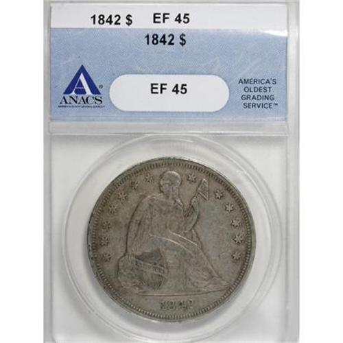 <B>1842 $1 XF45 ANACS.</B></I> NGC Census: (46/258). PCGS Population (75/234). Mintage: 184,618. Numismedia Wsl. Price for NGC/PCGS coin in XF45: $454. (#6928)<BR><BR><B>Coin Engraver:</B> Christian Gobrecht<BR><BR><b>Shipping:</b> Coins & Currency (<a target="_blank" href="http://www.heritageauctions.com/common/shipping.php">view shipping information</a>)