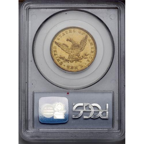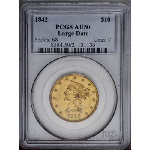 <B>1842<$10> Large Date AU50 PCGS.</B></I> About 63,000 examples of the Large Date were minted, compared with about 19,000 pieces of the Small Date. Both issues are usually encountered in XF or VF condition. Honey-gold surfaces are imbued with traces of lime-green, and exhibit an even distribution of minute contact marks. The design elements retain fairly good definition, though the hair curl over the ear is weak. Population: 12 in 50, 22 finer (2/06).