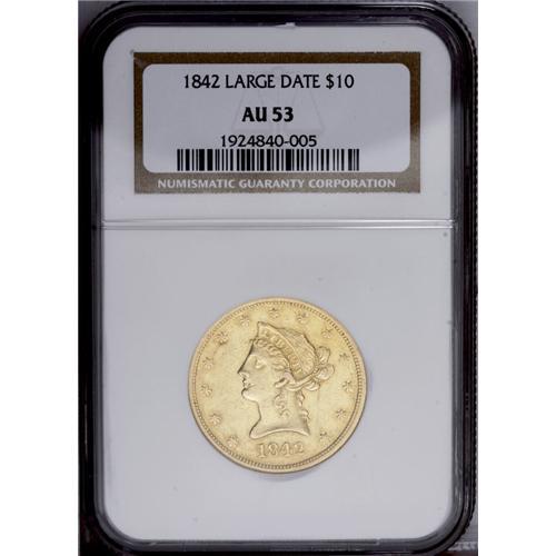 <B>1842<$10> Large Date AU53 NGC.</B></I> A bold representative that has noticeable orange-tinged luster. The only relevant mark is located in the field beneath the fletchings. A network of slender die cracks crosses the eagle. <BR><BR><B>Important notice:<