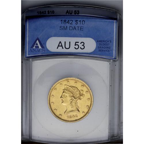 <B>1842<$10> Small Date AU53 ANACS.</B></I> This bold early date Liberty eagle has its share of small to moderate marks, but only a nick on the reverse rim at 9:30 merits mention. Richly detailed, and luster is abundant throughout the reverse border. <BR><BR><B>Important notice:</B> Heritage usually auctions material at the rate of 200-250 lots per hour. On some occasions eBay Live bid software or the Internet may not be able to keep up with the pace of the auction. We recommend placing a realistic absentee bid now as insurance to avoid disappointment. Occasionally the auctioneer may eliminate or reject an eBay Live bid, and the auctioneer may also reopen a lot after the close of the eBay live bidding (usually because we missed an audience bid), and may reject your bid even if it shows you as the winning bidder. By bidding via eBay Live, you agree that Heritage may award the lot to another bidder at its sole discretion under the circumstances described above or any other reasonable circumstances. Since eBay bids are not shown to us until we open the lot on the floor, we treat those bids just like floor bids. In most cases the floor responds before the eBay bid is presented to us, due to Internet lag time, so for consistency we have made it a policy that floor bids are always considered first over tie eBay live bids. Also please note that all Heritage lots purchased through eBay Live carry a 20% Buyer's Premium. Please make sure you read the Terms and Conditions before you bid. This lot is being auctioned in conjunction with a live floor auction by Heritage Galleries & Auctioneers. All final auction and invoice information will be supplied by Heritage Galleries & Auctioneers, and all other information should be considered preliminary. Lot:3912 <BR><BR><B>Winning Notification and Billing:</B> After the FINAL session in this auction is complete, Heritage will send e-mail and snail mail invoices. This process normally takes several days. All final auction and invoice information will be supplied by Heritage Galleries & Auctioneers, and all other information should be considered preliminary. <BR><BR>This auction will be conducted on a live auction floor and over the Internet through eBay Live. If you choose to place an absentee bid, please take a moment to <font color='#0000ff'><u><a href='http://pages.ebay.com/liveauctions/help/before/laabsentee.html'>learn how eBay Live absentee bidding works</a></u></font><font color='#000000'>
