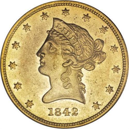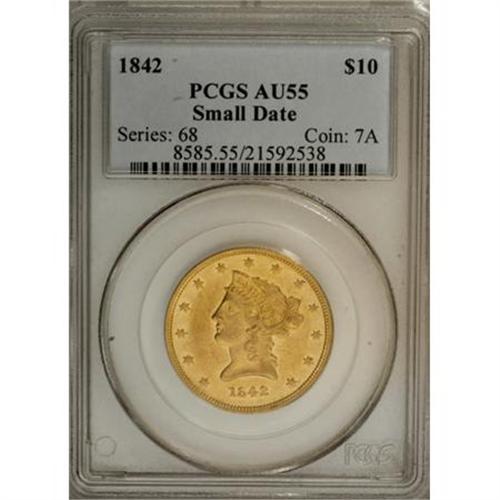 <B>1842 $10 Small Date AU55 PCGS.</B></I> Moderately abraded with attractive deep reddish-gold color and a few faint blushes of orange patina at the margins. A lengthy die break across the left side of the reverse bisects the eagle's shield and wing. The tiny population of this issue is skewed on the low side since both Large Dates and Small Dates were once grouped under the PCGS number of the former. Population: 4 in 55, 5 finer (12/07).<BR><BR><B>Coin Engraver:</B> Christian Gobrecht<BR><BR><b>Shipping:</b> Coins & Currency (<a target="_blank" href="http://www.heritageauctions.com/common/shipping.php">view shipping information</a>)