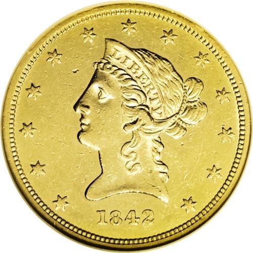 <B>1842<$10> Small Date AU58 NGC.</B></I> One of the nicer 1842 Small Date eagles we have offered, this example is notable for bright yellow-gold surfaces and excellent sharpness in virtually all areas. A lengthy die break across the left side of the reverse has been seen on other late die state pieces. Although a bit less rare than its Large Date counterpart despite similar populations (both varieties were once grouped under the Large Date number), the 1842 Small Date is particularly scarce in grades approaching Mint State. Census: 12 in 58, 7 finer (3/06). <BR><BR><B>Important notice:</B> Heritage usually auctions material at the rate of 200-250 lots per hour. On some occasions eBay Live bid software or the Internet may not be able to keep up with the pace of the auction. We recommend placing a realistic absentee bid now as insurance to avoid disappointment. Occasionally the auctioneer may eliminate or reject an eBay Live bid, and the auctioneer may also reopen a lot after the close of the eBay live bidding (usually because we missed an audience bid), and may reject your bid even if it shows you as the winning bidder. By bidding via eBay Live, you agree that Heritage may award the lot to another bidder at its sole discretion under the circumstances described above or any other reasonable circumstances. Since eBay bids are not shown to us until we open the lot on the floor, we treat those bids just like floor bids. In most cases the floor responds before the eBay bid is presented to us, due to Internet lag time, so for consistency we have made it a policy that floor bids are always considered first over tie eBay live bids. Also please note that all Heritage lots purchased through eBay Live carry a 20% Buyer's Premium. Please make sure you read the Terms and Conditions before you bid. This lot is being auctioned in conjunction with a live floor auction by Heritage Galleries & Auctioneers. All final auction and invoice information will be supplied by Heritage Galleries & Auctioneers, and all other information should be considered preliminary. Lot:3913 <BR><BR><B>Winning Notification and Billing:</B> After the FINAL session in this auction is complete, Heritage will send e-mail and snail mail invoices. This process normally takes several days. All final auction and invoice information will be supplied by Heritage Galleries & Auctioneers, and all other information should be considered preliminary. <BR><BR>This auction will be conducted on a live auction floor and over the Internet through eBay Live. If you choose to place an absentee bid, please take a moment to <font color='#0000ff'><u><a href='http://pages.ebay.com/liveauctions/help/before/laabsentee.html'>learn how eBay Live absentee bidding works</a></u></font><font color='#000000'>