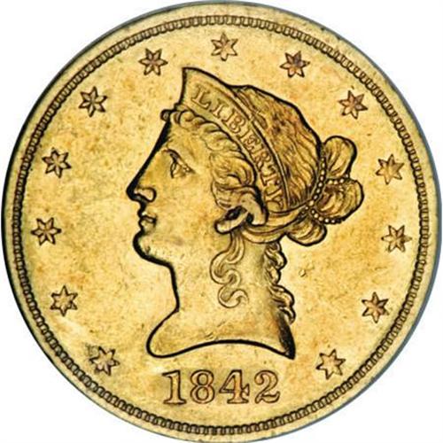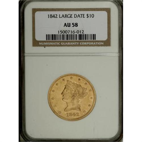 <B>1842 $10 Large Date AU58 NGC.</B></I> While the Large Date variant might be more available in lower grades, at levels approaching Mint State, the Small Date and Large Date varieties pull nearly even. This pleasing example of the latter shows just a touch of wear on the highpoints of Liberty's hair, and the lightly abraded wheat-gold fields retain vibrant luster. On the reverse, the eagle offers excellent detail. Census: 7 in 58, 2 finer (1/08).<BR><BR><B>Coin Engraver:</B> Christian Gobrecht<BR><BR><b>Shipping:</b> Coins & Currency (<a target="_blank" href="http://www.heritageauctions.com/common/shipping.php">view shipping information</a>)