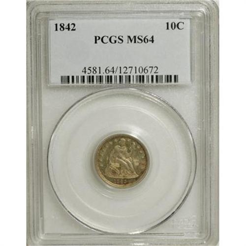 <B>1842 10C MS64 PCGS.</B></I> Relatively strong field-motif contrast is apparent on both sides of this near-Gem, each of which displays whispers of yellow-gold, mint-green, and purple toning. Generally well struck, and minimally abraded. Population: 10 in 64, 8 finer (3/08).<BR><BR><B>Coin Engraver:</B> Christian Gobrecht<BR><BR><b>Shipping:</b> Coins & Currency (<a target="_blank" href="http://www.heritageauctions.com/common/shipping.php">view shipping information</a>)