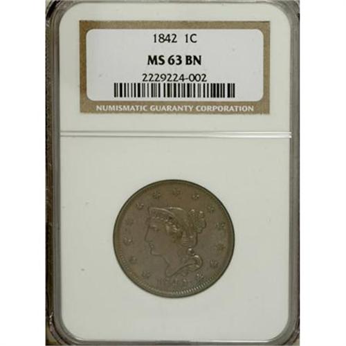 <B>1842 1C Large Date MS63 Brown NGC.</B></I> NGC Census: (21/46). PCGS Population (21/16). Mintage: 2,383,390. Numismedia Wsl. Price for NGC/PCGS coin in MS63: $300. (#1835)<BR><BR><B>Coin Engraver:</B> Christian Gobrecht<BR><BR><b>Shipping:</b> Coins & Currency (<a target="_blank" href="http://www.heritageauctions.com/common/shipping.php">view shipping information</a>)