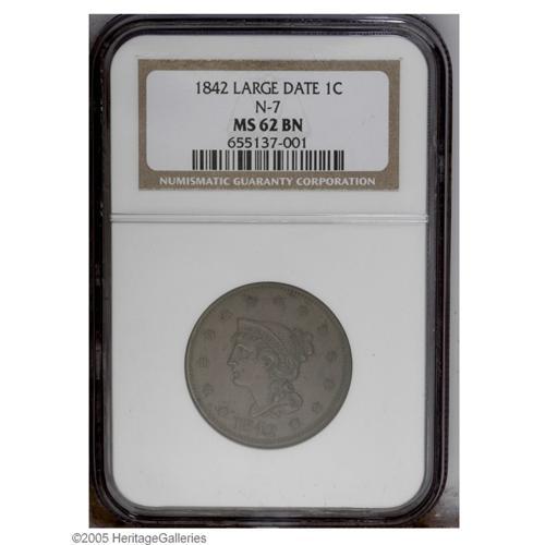 1842 1C Large Date MS62 Brown NGC. N-7, Die State B, 1842[1C] Large Date MS62 Brown NGC.