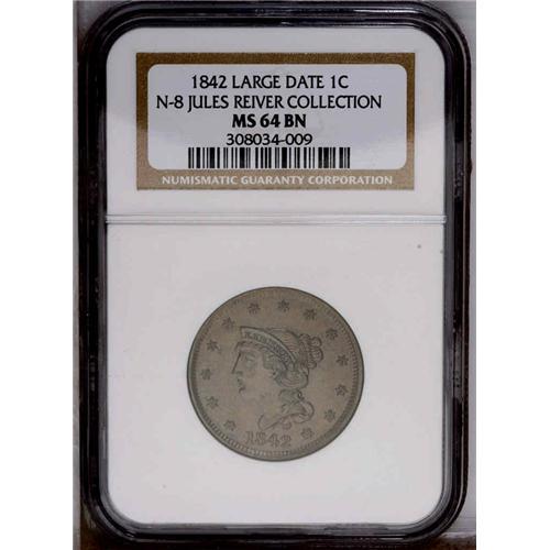 1842 1C Large Date MS64 Brown NGC. N-3, R.1. GDS b. An 1842[1C] Large Date. N-3, R.3. MS64 Brown NGC