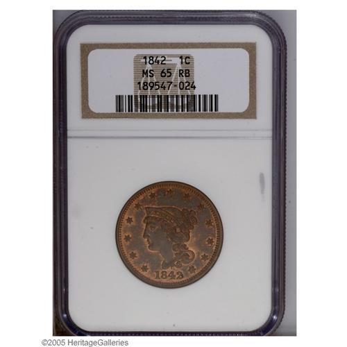1842 1C Large Date MS65 Red and Brown PCGS. N-8, R.1. 1842[1C] Large Date MS65 Red and Brown PCGS.