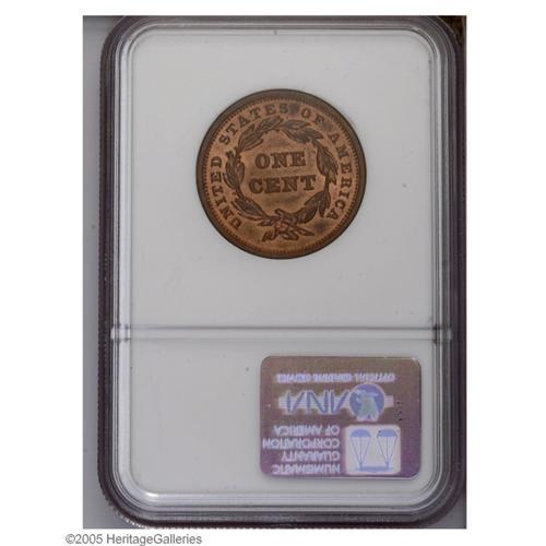 <B>1842<1C> Large Date MS65 Red and Brown PCGS.</B></I> N-8, R.1. A splendid Gem example with about 25% red on the obverse and 75% or more on the reverse. The surfaces have a few minor blemishes and spots, but overall are quite pleasing.
