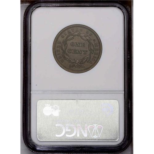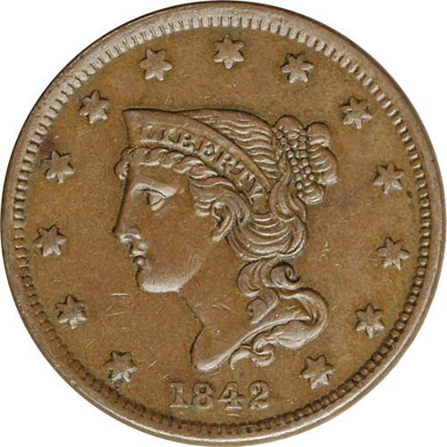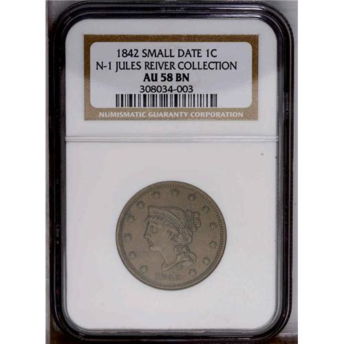 <B>1842<1C> Small Date. N-1, R.3. AU58 NGC. VF35 EAC.</B></I> Grellman state a to b. The die lump under the 4 is present but faint (it is absent in Grellman state b), a die line is seen at the bases of IT in UNITED but does not continue through TED (Grellman state a). An attractive chocolate-brown representative with only minor friction on the devices, and small marks are mostly absent save for ticks near the chin and on the neck. A planchet flaw is east of the T in CENT. The stars are flat, but the wreath and portrait have rich definition. A challenging variety as Mint State is approached.<BR><I>Ex: Stack's (12/26/1989).</B></I> Envelope Included.
