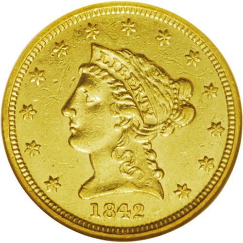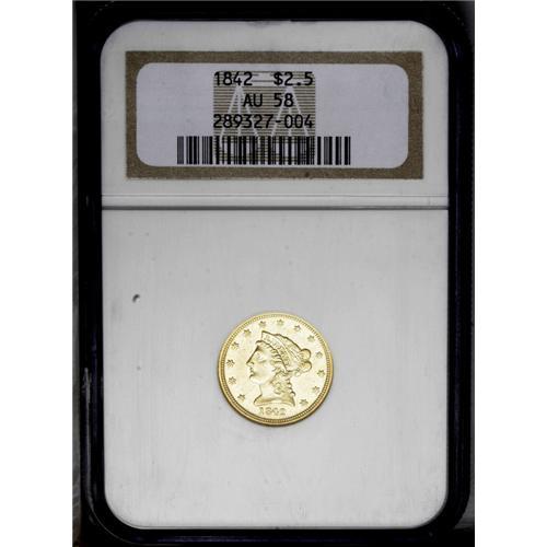 <B>1842<$2 1/2> AU58 NGC.</B></I> A prohibitively rare coin in this grade, and one of the finest to exist behind just two certified Mint State examples. The surfaces are attractive with the usual scattering of handling ticks well blended into the fields and devices. A sharp strike produced separation on the feathers and thigh, although the right claws show expected softness. The total coined for the year was just 2,823 pieces, most of which were lost or circulated for years into much lower grades. For the date collector, the present coin represents a significant challenge in any grade even approaching this, and this specimen is well within the top dozen known. Census: 5 in 58, 1 finer (3/06). <BR><BR><B>Important notice:</B> Heritage usually auctions material at the rate of 200-250 lots per hour. On some occasions eBay Live bid software or the Internet may not be able to keep up with the pace of the auction. We recommend placing a realistic absentee bid now as insurance to avoid disappointment. Occasionally the auctioneer may eliminate or reject an eBay Live bid, and the auctioneer may also reopen a lot after the close of the eBay live bidding (usually because we missed an audience bid), and may reject your bid even if it shows you as the winning bidder. By bidding via eBay Live, you agree that Heritage may award the lot to another bidder at its sole discretion under the circumstances described above or any other reasonable circumstances. Since eBay bids are not shown to us until we open the lot on the floor, we treat those bids just like floor bids. In most cases the floor responds before the eBay bid is presented to us, due to Internet lag time, so for consistency we have made it a policy that floor bids are always considered first over tie eBay live bids. Also please note that all Heritage lots purchased through eBay Live carry a 20% Buyer's Premium. Please make sure you read the Terms and Conditions before you bid. This lot is being auctioned in conjunction with a live floor auction by Heritage Galleries & Auctioneers. All final auction and invoice information will be supplied by Heritage Galleries & Auctioneers, and all other information should be considered preliminary. Lot:2358 <BR><BR><B>Winning Notification and Billing:</B> After the FINAL session in this auction is complete, Heritage will send e-mail and snail mail invoices. This process normally takes several days. All final auction and invoice information will be supplied by Heritage Galleries & Auctioneers, and all other information should be considered preliminary. <BR><BR>This auction will be conducted on a live auction floor and over the Internet through eBay Live. If you choose to place an absentee bid, please take a moment to <font color='#0000ff'><u><a href='http://pages.ebay.com/liveauctions/help/before/laabsentee.html'>learn how eBay Live absentee bidding works</a></u></font><font color='#000000'>