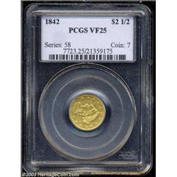 <table><tr><td><TABLE cellSpacing=0 cellPadding=0 width="100%" bgColor=#000000 border=0><TBODY> <TR><TD width="100%"><TABLE cellSpacing=1 cellPadding=3 width="100%" border=0><TBODY><TR><TD width="100%" bgColor=#79735c><FONT face=arial color=#ffffff size=3><B>Description</B> </FONT></TD></TR><TR><TD width="100%" bgColor=#ffffff><FONT face=arial size=2><B>1842 $2 1/2 VF25 PCGS.</B></I> A most difficult P-mint quarter eagle, with perhaps fewer than 60 pieces extant from a tiny mintage of 2,823 coins. The surfaces here show more than adequate detail, for the assigned grade, along with the expected high number of wispy surface blemishes and even wear throughout. A problem-free example which may be slightly undergraded at the current level.<BR><I>From The New Millennium Collection.</B></I> </FONT></TD></TR></TBODY></TABLE></TD></TR></TBODY></TABLE><BR><A name=PricesRealized></A><TABLE cellSpacing=0 cellPadding=0 width="100%" bgColor=#000000 border=0><TBODY><TR><TD width="100%"><TABLE cellSpacing=1 cellPadding=3 width="100%" border=0><TBODY><TR><TD width="100%" bgColor=#79735c><A name=PR><FONT face=arial color=#ffffff size=3><B>Previous Prices from Heritage Auctions</B> </FONT></A></TD></TR><TR><TD bgColor=#f6f6ed>No Prior Data Recorded </TD></TR><TR><TD bgColor=#ffffff><FONT face=arial size=1 ?>PLEASE NOTE: All prices realized reflect the final hammer price PLUS the buyer's premium in auctions that charge a buyer's premium. Each item has a notation at the top of the listing indicating whether that lot included a buyer's premium. Example: A item that sells with a final hammer price of $100 and a 20% buyer's premium will display with a price realized of $120. All information listed is intended to be as accurate as possible, but errors are possible. Please use this guide carefully and inform us of any inaccuracies. </FONT></TD></TR></TBODY></TABLE></TD></TR></TBODY></TABLE><BR><TABLE cellSpacing=0 cellPadding=0 width="100%" bgColor=#000000 border=0><TBODY><TR><TD width="100%"><TABLE cellSpacing=1 cellPadding=3 width="100%" border=0><TBODY><TR><TD width="100%" bgColor=#79735c colSpan=6><FONT face=arial color=#ffffff size=3><B>Price Guide*</B> </FONT></TD></TR><TR bgColor=#f6f6ed><TD align=middle><B>Grade</B> </TD><TD align=middle><B>Coin World<BR>(Trends)</B> </TD><TD align=middle><B>Numismedia<BR>Retail</B> </TD><TD align=middle><B>Numismedia<BR>Wholesale</B> </TD><TD align=middle><B>Coin<BR>Universe</B> </TD><TD align=middle><B>Heritage<BR>Value Index</B> </TD></TR><TR bgColor=#ffffff><TD align=middle>20</TD><TD align=right>$800.00</TD><TD align=right>---</TD><TD align=right>$850.00</TD><TD align=right>---</TD><TD align=right>$542.33</TD></TR><TR style="FONT-WEIGHT: bold" bgColor=#cccfdd><TD align=middle>25</TD><TD align=right>---</TD><TD align=right>---</TD><TD align=right>---</TD><TD align=right>---</TD><TD align=right>$813.42</TD></TR><TR bgColor=#ffffff><TD align=middle>30</TD><TD align=right>---</TD><TD align=right>---</TD><TD align=right>---</TD><TD align=right>$975.00</TD><TD align=right>$1,084.50</TD></TR><TR bgColor=#ffffff><TD colSpan=6><FONT size=1>*All information listed is intended to be as accurate as possible, but errors are possible. No item may be returned or refused based on this information which is provided as a service to our customers. You should contact each pricing source directly to determine the accuracy of this information. </FONT></TD></TR></TBODY></TABLE></TD></TR></TBODY></TABLE><BR><TABLE cellSpacing=0 cellPadding=0 width="100%" bgColor=#000000 border=0><TBODY><TR><TD width="100%"><TABLE cellSpacing=1 cellPadding=3 width="100%" border=0><TBODY><TR><TD width="100%" bgColor=#79735c><FONT face=arial color=#ffffff size=3><B>Population Guide</B> </FONT></TD></TR><TR bgColor=#ffffff><TD align=middle><!-- Begin Output of Population Grid--><TABLE cellSpacing=0 cellPadding=0 width="100%" border=0><TBODY><TR><TD vAlign=center><TABLE cellSpacing=0 width="100%" border=1 cellsadding="3"><TBODY><TR><TD vAlign=center><TABLE cellSpacing=0 cellPadding=3 width="100%" border=1><TBODY><TR><TD vAlign=center align=middle bgColor=#f0f1e8 colSpan=2 <CENTER><FONT face=Arial size=2><B>PCGS Pop </B></FONT><CENTER></CENTER></TD><TD vAlign=center align=middle bgColor=#f0f1e8 colSpan=2><CENTER><FONT face=Arial size=2><B>NGC Pop</B></CENTER></FONT></TD></TR><TR><TD vAlign=center><FONT face=Arial size=2>(25)</FONT> </TD><TD vAlign=center align=right><FONT face=Arial size=2>3</FONT> </TD><TD vAlign=center><FONT face=Arial size=2>(25)</FONT> </TD><TD vAlign=center align=right><FONT face=Arial size=2>0</FONT> </TD></TR><TR><TD vAlign=center><FONT face=Arial size=2>(>25)</FONT> </TD><TD vAlign=center align=right><FONT face=Arial size=2>22</FONT> </TD><TD vAlign=center><FONT face=Arial size=2>(>25)</FONT> </TD><TD vAlign=center align=right><FONT face=Arial size=2>19</FONT> </TD></TR></TBODY></TABLE></TD></TR></TBODY></TABLE></TD></TR></TBODY></TABLE><!-- End Output of Population Grid--></TD></TR></TBODY></TABLE></TD></TR></TBODY></TABLE><BR><TABLE cellSpacing=0 cellPadding=0 width="100%" bgColor=#000000 border=0><TBODY><TR> Important notice: Heritage usually auctions material at the rate of 200-250 lots per hour. On some occasions eBay Live bid software or the Internet may not be able to keep up with the pace of the auction. We recommend placing a realistic absentee bid now as insurance to avoid disappointment. Occasionally the auctioneer may eliminate or reject an eBay Live bid, and the auctioneer may also reopen a lot after the close of the eBay live bidding (usually because we missed an audience bid), and may reject your bid even if it shows you as the winning bidder. By bidding via eBay Live, you agree that Heritage may award the lot to another bidder at its sole discretion under the circumstances described above or any other reasonable circumstances. Also please note that all Heritage lots purchased through eBay Live carry a 20% Buyer's Premium. Please make sure you read the Terms and Conditions 