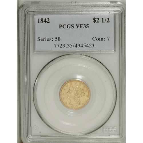 <B>1842<$2 1/2> VF35 PCGS.</B></I> This specimen boasts a low mintage of 2,823 pieces, and a much lower survival population in all grades. Characterized by pleasing color and uniform even wear, this is an appealing example on many levels. Population: 1 in 35, 19 finer (8/06).