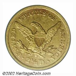 1842 $2 1/2 XF40 PCGS. The 1842 is one of those dates that doesn't stick in the mind as a standout rarity, and yet when one does appear it triggers the thought, "Hmmm...haven't seen one of these in a while." A quick look at the references on gold coins explains why: only 2,823 coins minted, and it is estimated that fewer than 60 pieces have survived today in all grades. This piece shows even wear over the highpoints. The green-gold surfaces are lightly abraded with a slight accent of red around the margins. Important notice: We expect to be auctioning lots at the rate of 200-250 per hour. Sometimes eBay Premier live bid software cannot keep up with that pace, so we strongly recommend that you place a realistic proxy bid now as insurance to avoid disappointment. Also please note that all Heritage/CAA lots purchased through eBay Premier carry a 20% Buyer's Premium. Please make sure you read the Terms and Conditions.