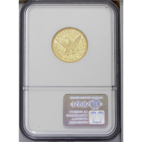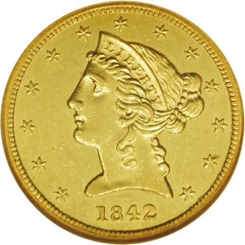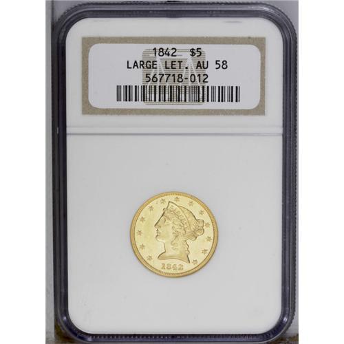 <B>1842<$5> Large Letters AU58 NGC.</B></I> An obvious lettering variant when one sees the Small Letters next to the Large Letters from this year. The Large Letters is the scarcer of the two varieties, and it is generally not found above VF. Only a handful of upper-end AU and Mint State coins have been seen by the two major services. This piece is sharply defined on each side with a hint of reflectivity in the fields that is intermingled with frost around the reverse legends. The only marks, and they are small, are a series of three abrasions above the eagle's head on the reverse. <BR><BR><B>Important notice:</B> Heritage usually auctions material at the rate of 200-250 lots per hour. On some occasions eBay Live bid software or the Internet may not be able to keep up with the pace of the auction. We recommend placing a realistic absentee bid now as insurance to avoid disappointment. Occasionally the auctioneer may eliminate or reject an eBay Live bid, and the auctioneer may also reopen a lot after the close of the eBay live bidding (usually because we missed an audience bid), and may reject your bid even if it shows you as the winning bidder. By bidding via eBay Live, you agree that Heritage may award the lot to another bidder at its sole discretion under the circumstances described above or any other reasonable circumstances. Since eBay bids are not shown to us until we open the lot on the floor, we treat those bids just like floor bids. In most cases the floor responds before the eBay bid is presented to us, due to Internet lag time, so for consistency we have made it a policy that floor bids are always considered first over tie eBay live bids. Also please note that all Heritage lots purchased through eBay Live carry a 20% Buyer's Premium. Please make sure you read the Terms and Conditions before you bid. This lot is being auctioned in conjunction with a live floor auction by Heritage Galleries & Auctioneers. All final auction and invoice information will be supplied by Heritage Galleries & Auctioneers, and all other information should be considered preliminary. Lot:2661 <BR><BR><B>Winning Notification and Billing:</B> After the FINAL session in this auction is complete, Heritage will send e-mail and snail mail invoices. This process normally takes several days. All final auction and invoice information will be supplied by Heritage Galleries & Auctioneers, and all other information should be considered preliminary. <BR><BR>This auction will be conducted on a live auction floor and over the Internet through eBay Live. If you choose to place an absentee bid, please take a moment to <font color='#0000ff'><u><a href='http://pages.ebay.com/liveauctions/help/before/laabsentee.html'>learn how eBay Live absentee bidding works</a></u></font><font color='#000000'>