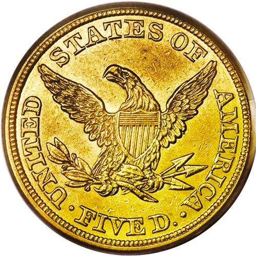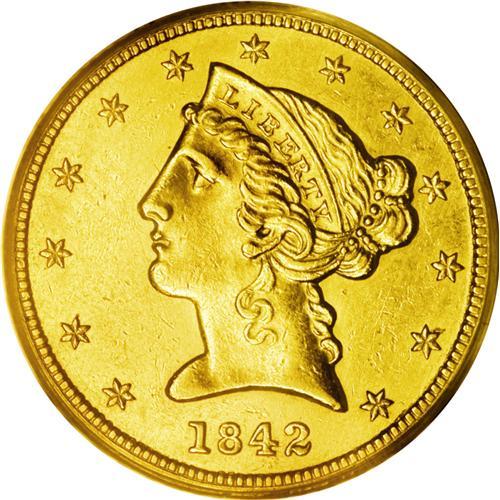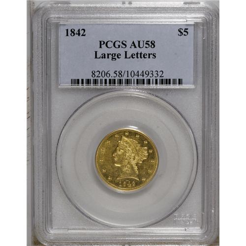 <B>1842<$5> Large Letters AU58 PCGS.</B></I> This is an attractive near-Mint example with brilliant yellow-gold color and vibrant luster. The fields of this example are satiny and slightly reflective. Two varieties of this scarce date have been identified, with either Small Letters or Large Letters and it seems that the two varieties are of approximately the same rarity, with the mintage of 27,578 1842 half eagles split about evenly. PCGS has only certified two finer examples of this Large Letters variety.