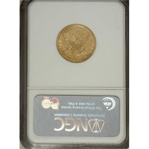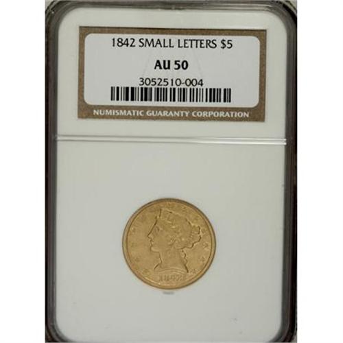 <B>1842 $5 Small Letters AU50 NGC.</B></I> A scarce coin in high grades and seldom seen in Mint State, the 1842 Small Letters half eagle is usually encountered with examples averaging AU50 or thereabouts, the grade of the present piece. The orange-gold surfaces show a bit of light field haze, with muted luster present around the device outlines, and there are no mentionable distractions on this attractive example. Census: 2 in 50, 14 finer (3/08).<BR><BR><B>Coin Engraver:</B> Christian Gobrecht<BR><BR><b>Shipping:</b> Coins & Currency (<a target="_blank" href="http://www.heritageauctions.com/common/shipping.php">view shipping information</a>)