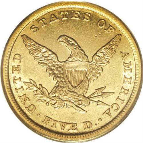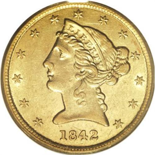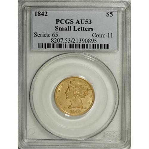 <B>1842 $5 Small Letters AU53 PCGS.</B></I> The two reverse 1842 subtypes divide a low mintage of 27,578 pieces, and AU survivors of either design subtype are very scarce. The present example is well struck save for minor softness on the hair bun, and the only remotely mentionable marks are relegated to the obverse border near star 10. Population: 3 in 53, 4 finer (8/07).<BR><BR><B>Coin Engraver:</B> Christian Gobrecht<BR><BR><b>Shipping:</b> Coins & Currency (<a target="_blank" href="http://www.heritageauctions.com/common/shipping.php">view shipping information</a>)