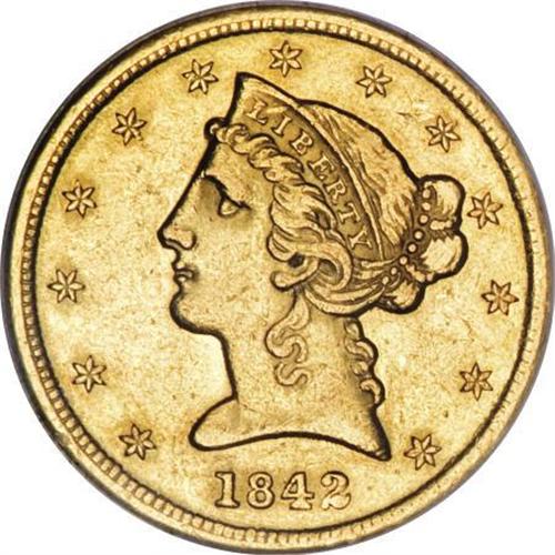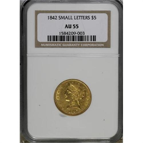 <B>1842 $5 Small Letters AU55 NGC.</B></I> Philadelphia Mint issues from the 1840s have a reputation of being common relative to their Charlotte and Dahlonega counterparts. This rule is broken for the 1842, which, according to Census reports, is rarer than the 1842-C Small Date and 1842-D Large Date. The mintage of 27,578 pieces was divided between Small Letters and Large Letters varieties, with the latter rarer. The present Choice AU example is well struck except for the curls near the bun. Abrasions are minor for the grade. Census: 6 in 55, 6 finer (2/08).<BR><BR><B>Coin Engraver:</B> Christian Gobrecht<BR><BR><b>Shipping:</b> Coins & Currency (<a target="_blank" href="http://www.heritageauctions.com/common/shipping.php">view shipping information</a>)