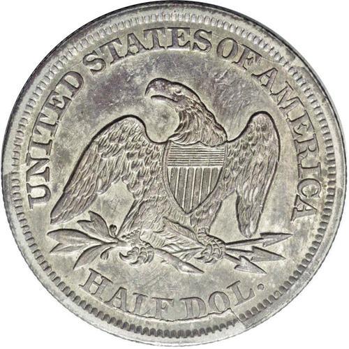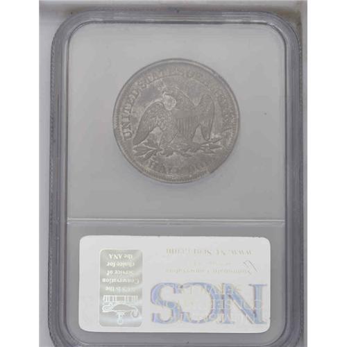<B>1842<50C> Medium Date, Large Letters--Environmental Damage--NCS. AU Details.</B></I> WB-105. The date is broadly repunched, most evident beneath the prominent 8. On the reverse, heavy die cracks (as made) atop UNITED and along the base of HALF DOL reach the rim and threaten to form retained breaks. This sharp representative is deeply toned in mauve and apple-green toned. Environmental damage appears minor, but some roughness is noted above the eagle's right (facing) shoulder.