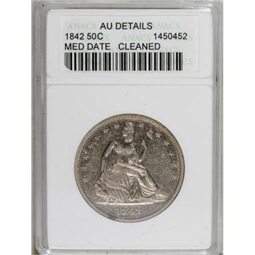 <B>1842 50C Medium Date, Large Letters--Cleaned--ANACS. AU Details.</B></I> NGC Census: (1/55). PCGS Population (14/70). Mintage: 2,012,764. Numismedia Wsl. Price for NGC/PCGS coin in AU50: $225. (#6239)<BR><BR><B>Coin Engraver:</B> Christian Gobrecht<BR><BR><b>Shipping:</b> Coins & Currency (<a target="_blank" href="http://www.heritageauctions.com/common/shipping.php">view shipping information</a>)