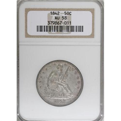 <B>1842 50C Medium Date, Large Letters AU58 NGC.</B></I> WB-105. Breen-4763. A prominent repunched date variety that shows the most visible duplication on the 8 and 4. Hints of green-gold and sage patina grace the otherwise silver-gray surfaces. The well struck devices show just a touch of friction. For all Medium Date, Large Letters varieties, Census: 16 in 58, 29 finer (10/07).<BR><BR><B>Coin Engraver:</B> Christian Gobrecht<BR><BR><b>Shipping:</b> Coins & Currency (<a target="_blank" href="http://www.heritageauctions.com/common/shipping.php">view shipping information</a>)