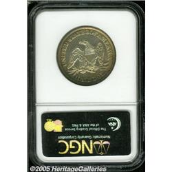 <B>1842 50C Medium Date, Large Letters MS62 NGC.</B></I> WB-105. The date is boldly repunched south. Ocean-blue and golden-brown patina invigorates the peripheries of this crisply struck Seated Half. The fields offer wispy slide marks but no bagmarks are present.