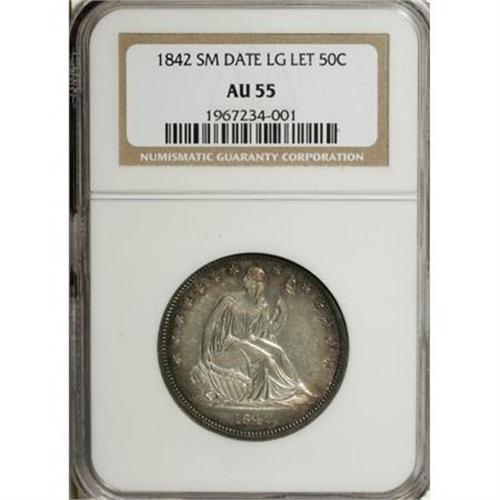 <B>1842 50C Small Date, Large Letters AU55 NGC.</B></I> NGC Census: (16/51). PCGS Population (12/23). (#6240)<BR><BR><B>Coin Engraver:</B> Christian Gobrecht<BR><BR><b>Shipping:</b> Coins & Currency (<a target="_blank" href="http://www.heritageauctions.com/common/shipping.php">view shipping information</a>)