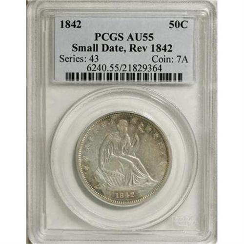 <B>1842 50C Small Date, Large Letters AU55 PCGS.</B></I> PCGS Population (12/23). NGC Census: (16/51). (#6240)<BR><BR><B>Coin Engraver:</B> Christian Gobrecht<BR><BR><b>Shipping:</b> Coins & Currency (<a target="_blank" href="http://www.heritageauctions.com/common/shipping.php">view shipping information</a>)