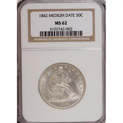 <B>1842 50C Medium Date, Large Letters MS62 NGC.</B></I> FS-301, WB-105. The "Tripled Date" variety, with the most obvious repunching on the base of the 8. Lustrous and nearly brilliant with a bold strike and minor field grazes. Census: 8 in 62, 12 finer (1/08).<BR><BR><B>Coin Engraver:</B> Christian Gobrecht<BR><BR><b>Shipping:</b> Coins & Currency (<a target="_blank" href="http://www.heritageauctions.com/common/shipping.php">view shipping information</a>)