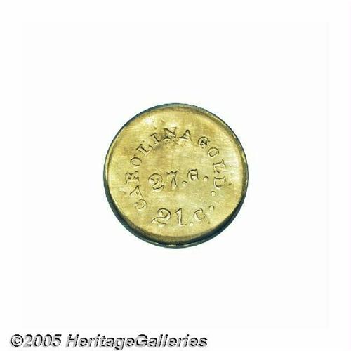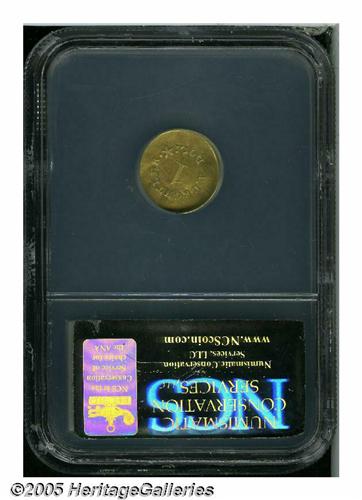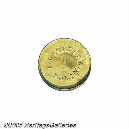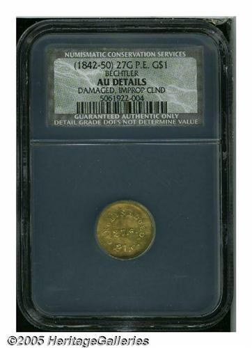 <B>(1842-52)<G$1> A.Bechtler Dollar, 27G. 21C. AU Details, Damaged, Improperly Cleaned, NCS.</B></I> K-24, R.3. A harshly cleaned and slightly wavy representative of this popular southern private gold variety. In selected areas, the hairlines are thick enough that it is possible the underlying surface has been smoothed or repaired. On the positive side, the legends show little evidence of wear. Listed on page 293 of the current 2005 <I>Guide Book.</B></I><BR><I>From The Great Western Collection of Territorial Gold.</B></I>