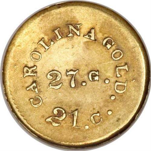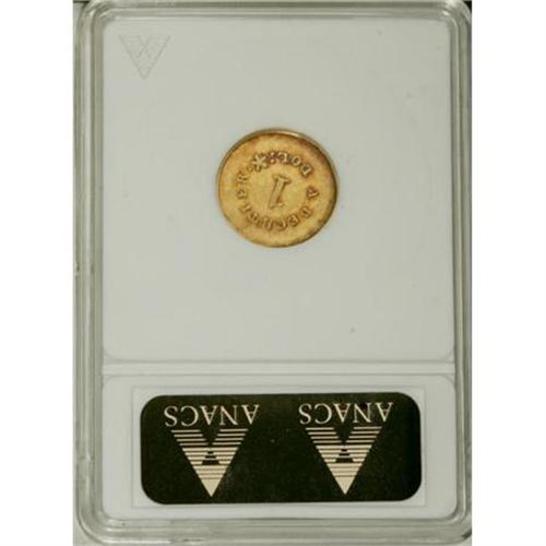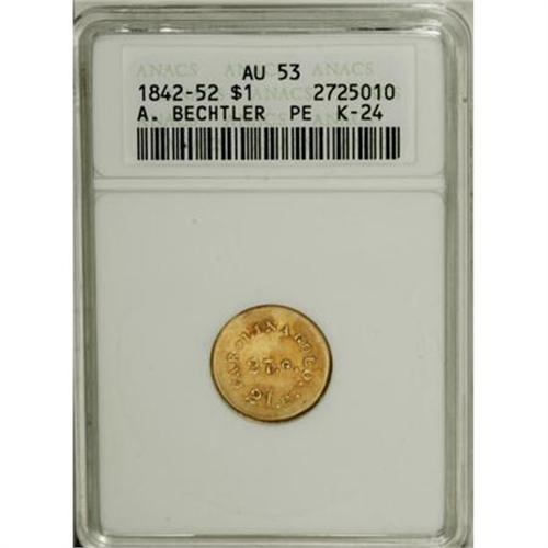 <B>(1842-52) G$1 A. Bechtler Dollar, 27G. 21C. AU53 ANACS.</B></I> K-24, R.3. Light yellow-gold with deeper honey-gold highlights and occasional glimpses of steel-blue and rose-red. Impressively unabraded and partly lustrous. Slightly buckled, as produced. The dies have close to medal turn, and exhibit distributed tiny freckles of rust, as made. Slender die cracks near BECHTLER further confirm the late die state. Listed on page 346 of the 2008 Guide Book.<BR><BR><b>Shipping:</b> Coins & Currency (<a target="_blank" href="http://www.heritageauctions.com/common/shipping.php">view shipping information</a>)