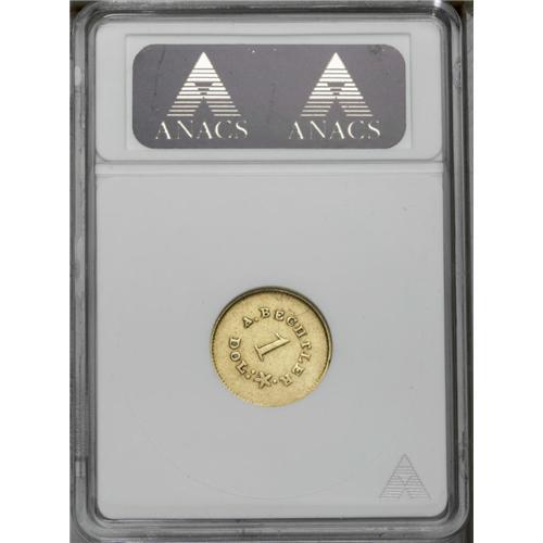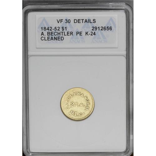 <B>(1842-52) G$1 A. Bechtler Dollar, 27G. 21C.--Cleaned--ANACS. VF30 Details.</B></I> K-24, R.3. A moderately worn example with bright, hairlined mustard-gold surfaces. An excellent choice for those who want an affordable example of Territorial gold.<BR><BR><b>Shipping:</b> Coin/Currency (<a target="_blank" href="http://www.heritageauctions.com/common/shipping.php">view shipping information</a>)