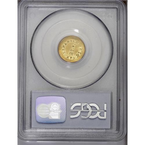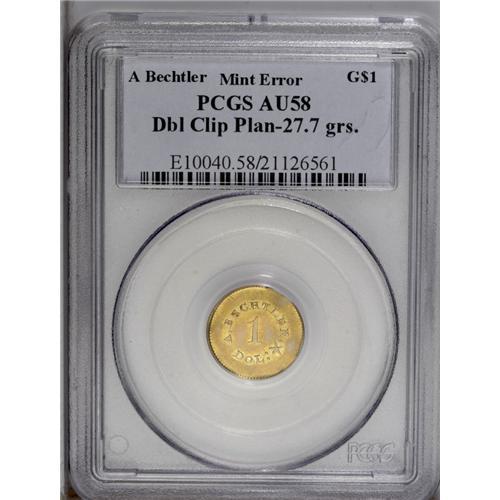 <B>(1842-52)<G$1> A.Bechtler Dollar, 27G. 21C.--Double Clipped Planchet--AU58 PCGS.</B></I> K-24, R.3. 27.7 grains. Small but noticeable clips are present at 1:30 and 4:30. Mintages of private gold coins were obviously closely inspected, as the credibility of the individual firm was reliant upon private assayers and the public perception of the firm's credibility. In this case, this gold dollar obviously contains less than the stated amount of gold, and the release of such a piece would have been risky for the Bechtler firm. This piece survived the inspection process and has remained in collector's hands since shortly after manufacture. The planchet shows the usual waviness and the coin has rich apricot and steel-blue toning. Listed on page 346 of the 2007 <I>Guide Book.</B></I><BR><I>From The Henderson Collection of U.S. Gold Errors.</B></I>