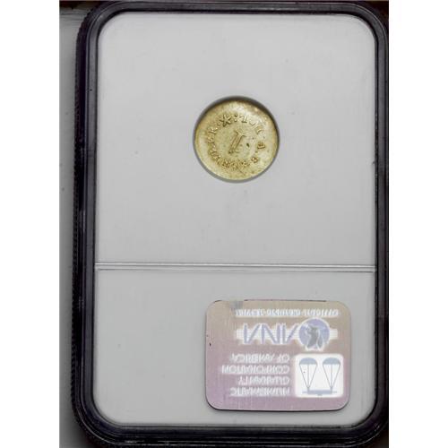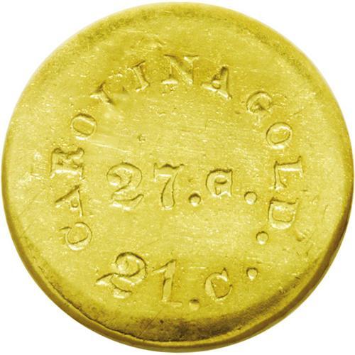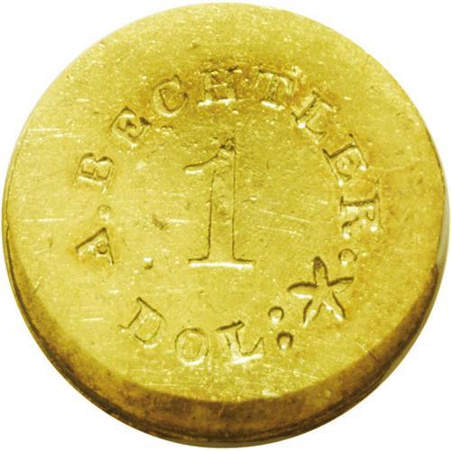 <B>(1842-52)<G$1> A.Bechtler Dollar, 27G. 21C. MS61 NGC.</B></I> K-24, R.3. A lustrous yellow-gold Bechtler type coin that lacks mentionable marks. Planchet waves are noted below DOL and 21 C. The dies are widely rotated. Gold coins produced by the Bechtler family circulated extensively in the South prior to the Civil War. Listed on page 346 of the 2007 <I>Red Book.</B></I>