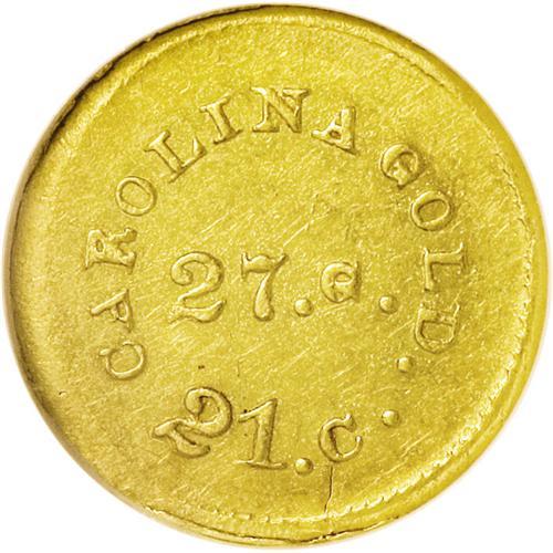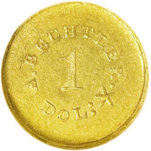 <B>(1842-52)<G$1> A.Bechtler Dollar, 27G. 21C. MS62 NGC.</B></I> Kagin-24, R.3. Struck from a die pair that was widely rotated in the press, with very nearly 90 degrees rotation between the obverse and reverse. Both dies have noticeable die rust and the reverse has several die cracks. Brilliant yellow-gold surfaces with excellent eye appeal. Both sides have full satiny luster. Listed on page 346 of the current 2007 <I>Guide Book.</B></I>
