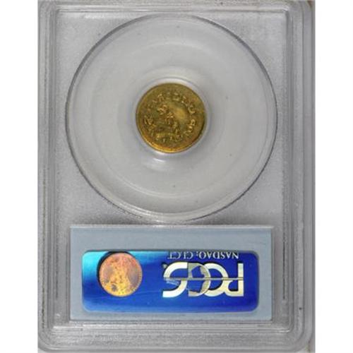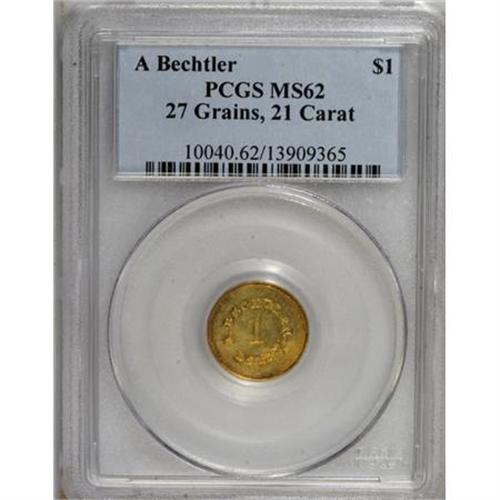 <B>(1842-52) G$1 A. Bechtler Dollar, 27G. 21C. MS62 PCGS.</B></I> K-24, R.3. A charming example with attractive orange and green-gold toning. The surfaces are mildly wavy, as taken from the dies, but abrasions are difficult to locate. By Bechtler gold standards, K-24 is available, yet attractive Mint State pieces are undeniably rare. Listed on page 346 of the 2008 <I>Guide Book.</B></I> Population: 11 in 62, 6 finer (8/07).<BR><BR><b>Shipping:</b> Coins & Currency (<a target="_blank" href="http://www.heritageauctions.com/common/shipping.php">view shipping information</a>)