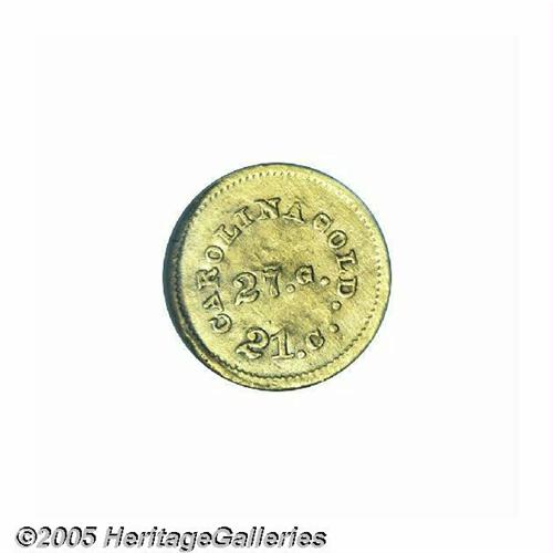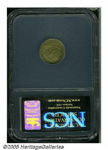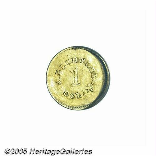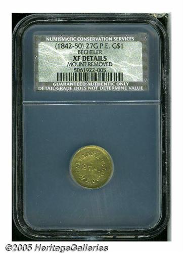 <B>(1842-52)<G$1> A.Bechtler Dollar, 27G. 21C. XF Details, Mount Removed, NCS.</B></I> K-24, R.3. This hairlined and mildly wavy example is mostly straw-gold in color. The rim shows subtle damage above the OL in CAROLINA and opposite above the H in BECHTLER, where a mount has been removed. An affordable entry piece into the Territorial series. Listed on page 293 of the current 2005 <I>Guide Book.</B></I><BR><I>From The Great Western Collection of Territorial Gold.</B></I>
