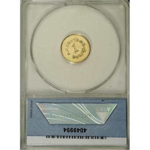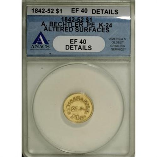<B>(1842-52) G$1 A. Bechtler Dollar, 27G. 21C., Plain Edge--Altered Surfaces--ANACS. XF40 Details.</B></I> K-24, R.3. Bright yellow-gold surfaces have been polished, and reveal numerous hairlines. Repairs have been made on the central reverse.<BR><BR><b>Shipping:</b> Coins & Currency (<a target="_blank" href="http://www.heritageauctions.com/common/shipping.php">view shipping information</a>)
