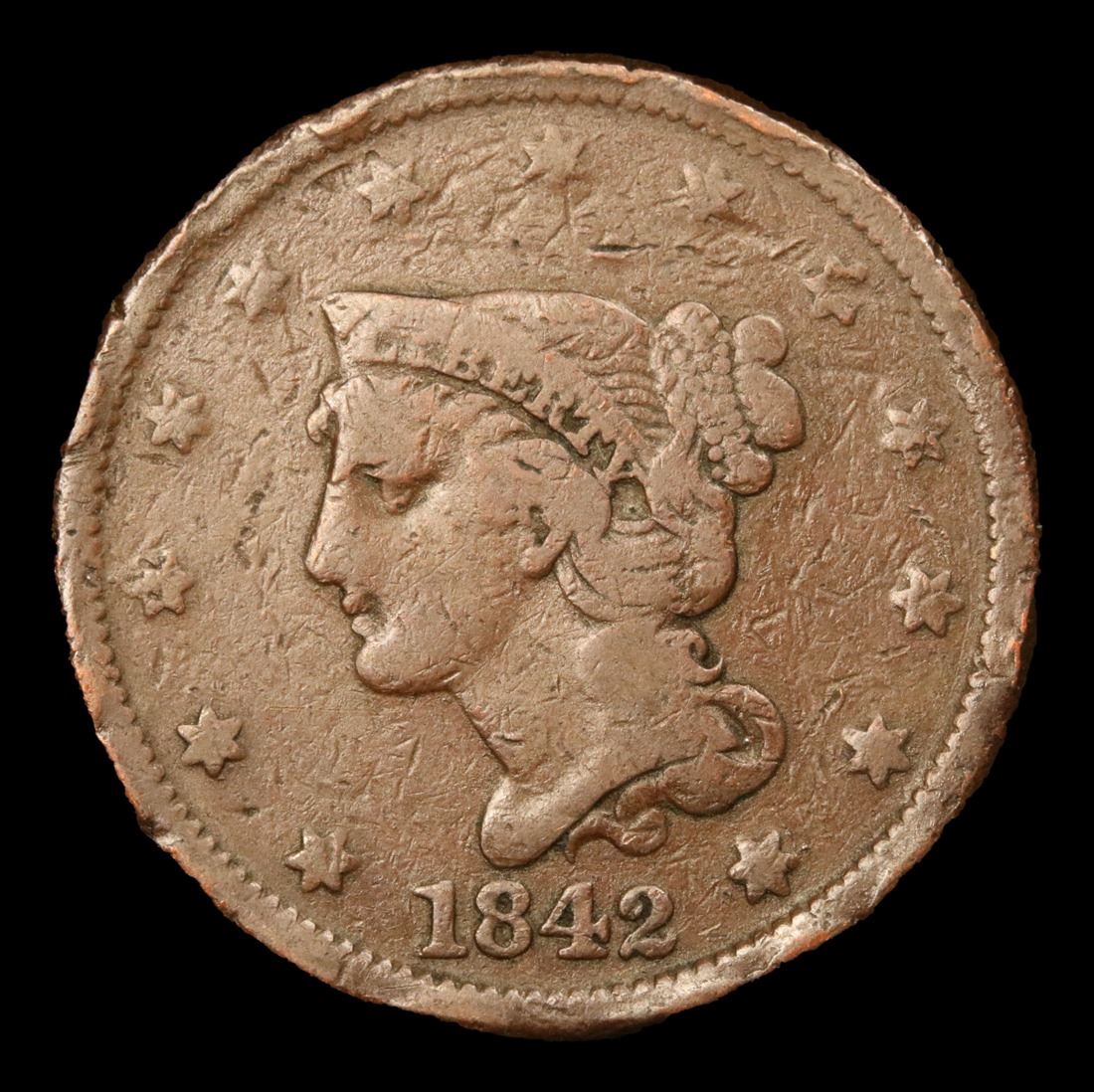 1842 . . Braided Hair Large Cent 1c Grades f+.