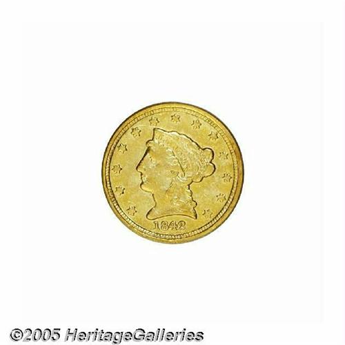 <B>1842-C<$2 1/2> AU50 PCGS.</B></I> Variety 3-B. A very scarce early Charlotte issue that belies its already small mintage of 6,729 pieces, having been given an overall rarity ranking of third among the twenty C-mint Quarter Eagle issues by Doug Winter in his most recent work on <I>Gold Coins of the Charlotte Mint, 1838-1861.</B></I> This example displays average or better sharpness for a '42-C and is light in color with blushes of coppery patina here and there. There are a few small abrasions overall, however, none are worthy of singular mention. Population: 6 in 50, 13 finer (6/05).