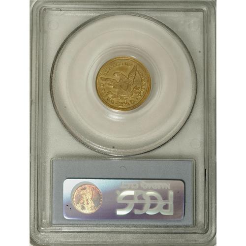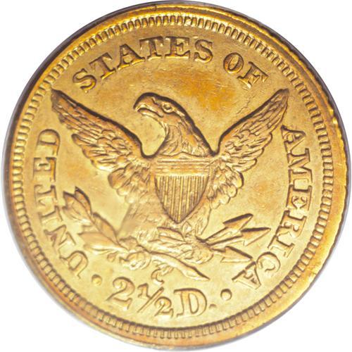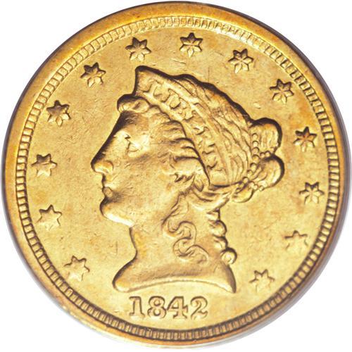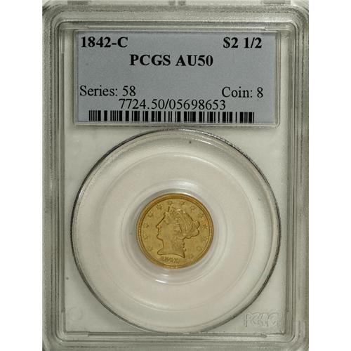<B>1842-C $2 1/2 AU50 PCGS.</B></I> Variety 3-B. According to branch mint gold authority Douglas Winter, the 1842-C Quarter Eagle is one of the rarest coins of any denomination from the Charlotte Mint, and is the rarest Quarter Eagle from that mint in higher grades. Only 6,729 pieces were struck, and those circulated for nearly twenty years, until the Civil War. This piece is attractive for the grade, as the surfaces have not been brightened, and there are no mentionable handling marks. The lower stars are incompletely brought up, as is the eagle's lower leg, but the overall impression is sharp. Population: 5 in 50, 14 finer (3/07).<BR><BR><b>Shipping:</b> Coins & Currency (<a target="_blank" href="http://www.heritageauctions.com/common/shipping.php">view shipping information</a>)