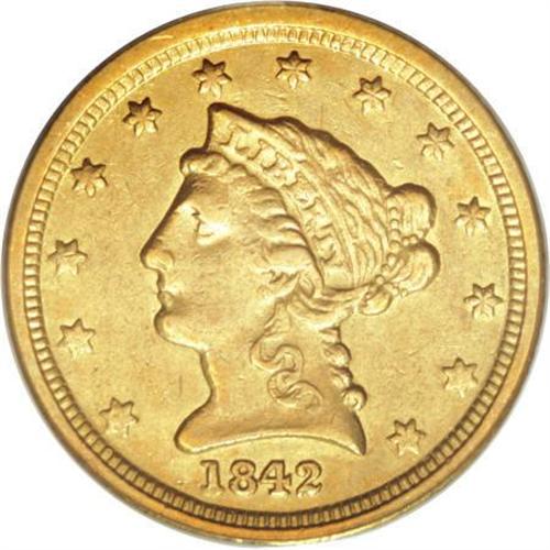 <B>1842-C $2 1/2 AU50 PCGS.</B></I> Variety 3-B. A nicely struck khaki-gold example of this rare Charlotte quarter eagle issue. A mere 6,729 pieces were struck, and few if any were set aside for numismatic consideration until several decades later. The slightly glossy surfaces are surprisingly void of marks. Population: 5 in 50, 14 finer (7/07).<BR><BR><B>Coin Engraver:</B> Christian Gobrecht<BR><BR><b>Shipping:</b> Coins & Currency (<a target="_blank" href="http://www.heritageauctions.com/common/shipping.php">view shipping information</a>)