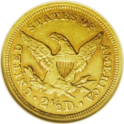 <B>1842-C<$2 1/2> AU55 NGC.</B></I> Variety 3-B. Just 6,729 pieces were produced for this challenging Charlotte issue. The remaining luster has a deep reddish-gold hue, and the rest of the piece is light yellow-gold in color. Striking softness is generally localized to the eagle's left (facing) leg. One minor mark is noted above the final star, but the overall appearance is unblemished and bright. Census: 8 in 55, 11 finer (4/06).