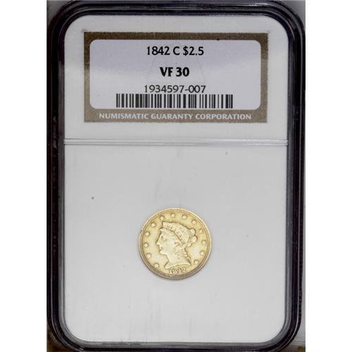 <B>1842-C<$2 1/2> VF30 NGC.</B></I> Variety 3-B. Honey-gold toning outlines typically struck design elements. The obverse rim has a small strike-through at 10 o'clock, and a brief pinscratch is noted above the eagle's left (facing) wing.