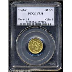 <table><tr><td><TABLE cellSpacing=0 cellPadding=0 width="100%" bgColor=#000000 border=0><TBODY> <TR><TD width="100%"><TABLE cellSpacing=1 cellPadding=3 width="100%" border=0><TBODY><TR><TD width="100%" bgColor=#79735c><FONT face=arial color=#ffffff size=3><B>Description</B> </FONT></TD></TR><TR><TD width="100%" bgColor=#ffffff><FONT face=arial size=2><B>1842-C $2 1/2 VF35 PCGS.</B></I> Winter 3-B. One of the most challenging C-mint Quarter Eagles, given a 3rd place ranking for overall rarity in the Winter reference. A mere 6,729 pieces were originally struck and less than 70 survivors are believed extant. The central details of this bright green-gold example are typically indistinct and moderate abrasions are scattered over both sides.<BR><I>From The New Millennium Collection.</B></I> </FONT></TD></TR></TBODY></TABLE></TD></TR></TBODY></TABLE><BR><A name=PricesRealized></A><TABLE cellSpacing=0 cellPadding=0 width="100%" bgColor=#000000 border=0><TBODY><TR><TD width="100%"><TABLE cellSpacing=1 cellPadding=3 width="100%" border=0><TBODY><TR><TD width="100%" bgColor=#79735c><A name=PR><FONT face=arial color=#ffffff size=3><B>Previous Prices from Heritage Auctions</B> </FONT></A></TD></TR><TR><TD bgColor=#f6f6ed><TABLE cellSpacing=0 cellPadding=0 width="100%" border=1><TBODY><TR><TD align=middle width="33%"><B>Date</B></TD><TD align=middle width="33%"><B>Service</B></TD><TD align=middle width="33%"><B>Price</B></TD></TR><TR bgColor=whitesmoke><TD width="33%"><B>05/01/1999</B></TD><TD width="33%">PCGS</TD><TD width="33%">$1,955.00</TD></TR><TR bgColor=whitesmoke><TD width="33%"><B>01/01/1996</B></TD><TD width="33%">PCGS</TD><TD width="33%">$1,100.00</TD></TR></TBODY></TABLE></TD></TR><TR><TD bgColor=#ffffff><FONT face=arial size=1 ?>PLEASE NOTE: All prices realized reflect the final hammer price PLUS the buyer's premium in auctions that charge a buyer's premium. Each item has a notation at the top of the listing indicating whether that lot included a buyer's premium. Example: A item that sells with a final hammer price of $100 and a 20% buyer's premium will display with a price realized of $120. All information listed is intended to be as accurate as possible, but errors are possible. Please use this guide carefully and inform us of any inaccuracies. </FONT></TD></TR></TBODY></TABLE></TD></TR></TBODY></TABLE><BR><TABLE cellSpacing=0 cellPadding=0 width="100%" bgColor=#000000 border=0><TBODY><TR><TD width="100%"><TABLE cellSpacing=1 cellPadding=3 width="100%" border=0><TBODY><TR><TD width="100%" bgColor=#79735c colSpan=6><FONT face=arial color=#ffffff size=3><B>Price Guide*</B> </FONT></TD></TR><TR bgColor=#f6f6ed><TD align=middle><B>Grade</B> </TD><TD align=middle><B>Coin World<BR>(Trends)</B> </TD><TD align=middle><B>Numismedia<BR>Retail</B> </TD><TD align=middle><B>Numismedia<BR>Wholesale</B> </TD><TD align=middle><B>Coin<BR>Universe</B> </TD><TD align=middle><B>Heritage<BR>Value Index</B> </TD></TR><TR bgColor=#ffffff><TD align=middle>30</TD><TD align=right>---</TD><TD align=right>---</TD><TD align=right>---</TD><TD align=right>$1,400.00</TD><TD align=right>$1,301.67</TD></TR><TR style="FONT-WEIGHT: bold" bgColor=#cccfdd><TD align=middle>35</TD><TD align=right>---</TD><TD align=right>---</TD><TD align=right>---</TD><TD align=right>---</TD><TD align=right>$1,660.00</TD></TR><TR bgColor=#ffffff><TD align=middle>40</TD><TD align=right>$3,000.00</TD><TD align=right>---</TD><TD align=right>$1,850.00</TD><TD align=right>$2,950.00</TD><TD align=right>$2,018.33</TD></TR><TR bgColor=#ffffff><TD colSpan=6><FONT size=1>*All information listed is intended to be as accurate as possible, but errors are possible. No item may be returned or refused based on this information which is provided as a service to our customers. You should contact each pricing source directly to determine the accuracy of this information. </FONT></TD></TR></TBODY></TABLE></TD></TR></TBODY></TABLE><BR><TABLE cellSpacing=0 cellPadding=0 width="100%" bgColor=#000000 border=0><TBODY><TR><TD width="100%"><TABLE cellSpacing=1 cellPadding=3 width="100%" border=0><TBODY><TR><TD width="100%" bgColor=#79735c><FONT face=arial color=#ffffff size=3><B>Population Guide</B> </FONT></TD></TR><TR bgColor=#ffffff><TD align=middle><!-- Begin Output of Population Grid--><TABLE cellSpacing=0 cellPadding=0 width="100%" border=0><TBODY><TR><TD vAlign=center><TABLE cellSpacing=0 width="100%" border=1 cellsadding="3"><TBODY><TR><TD vAlign=center><TABLE cellSpacing=0 cellPadding=3 width="100%" border=1><TBODY><TR><TD vAlign=center align=middle bgColor=#f0f1e8 colSpan=2 <CENTER><FONT face=Arial size=2><B>PCGS Pop </B></FONT><CENTER></CENTER></TD><TD vAlign=center align=middle bgColor=#f0f1e8 colSpan=2><CENTER><FONT face=Arial size=2><B>NGC Pop</B></CENTER></FONT></TD></TR><TR><TD vAlign=center><FONT face=Arial size=2>(35)</FONT> </TD><TD vAlign=center align=right><FONT face=Arial size=2>12</FONT> </TD><TD vAlign=center><FONT face=Arial size=2>(35)</FONT> </TD><TD vAlign=center align=right><FONT face=Arial size=2>1</FONT> </TD></TR><TR><TD vAlign=center><FONT face=Arial size=2>(>35)</FONT> </TD><TD vAlign=center align=right><FONT face=Arial size=2>35</FONT> </TD><TD vAlign=center><FONT face=Arial size=2>(>35)</FONT> </TD><TD vAlign=center align=right><FONT face=Arial size=2>39</FONT> </TD></TR></TBODY></TABLE></TD></TR></TBODY></TABLE></TD></TR></TBODY></TABLE><!-- End Output of Population Grid--></TD></TR></TBODY></TABLE></TD></TR></TBODY></TABLE><BR><TABLE cellSpacing=0 cellPadding=0 width="100%" bgColor=#000000 border=0><TBODY><TR> Important notice: Heritage usually auctions material at the rate of 200-250 lots per hour. On some occasions eBay Live bid software or the Internet may not be able to keep up with the pace of the auction. We recommend placing a realistic absentee bid now as insurance to avoid disappointment. Occasionally the auctioneer may eliminate or reject an eBay Live bid, and the auctioneer may also reopen a lot after the close of the eB