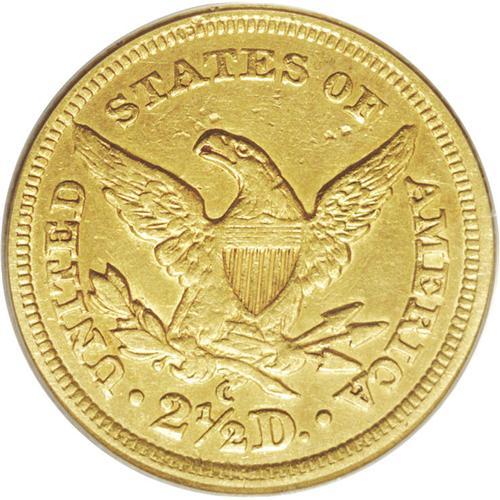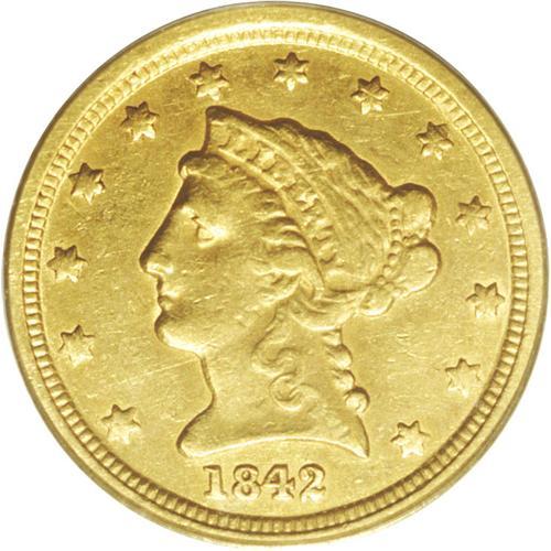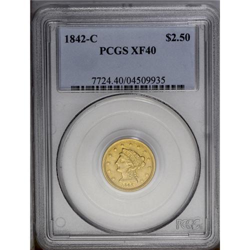 <B>1842-C $2 1/2 XF40 PCGS.</B></I> Variety 3-B. The '42-C is one of the rarest Charlotte quarter eagles, and one of the rarest coins of any denomination ever struck at that Mint. Only 55 to 65 pieces are estimated to exist, with the majority falling into the VF grade level. It becomes extremely rare in XF, the grade of the present example. Apricot-gold patination reveals lime-green accents, and the design elements display better-than-average detail, though some of the star centers and eagle's plumage are soft. While most known pieces are heavily marked, the surfaces on this coin are relatively clean, exhibiting just a few minute marks on Liberty's cheek.<BR><I>From The Carolina Gold Collection, Part Two.</B></I>