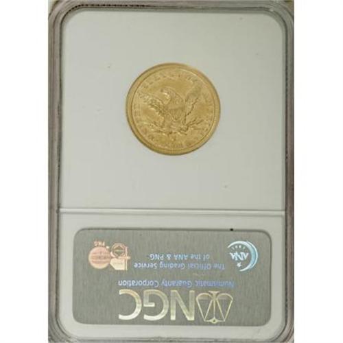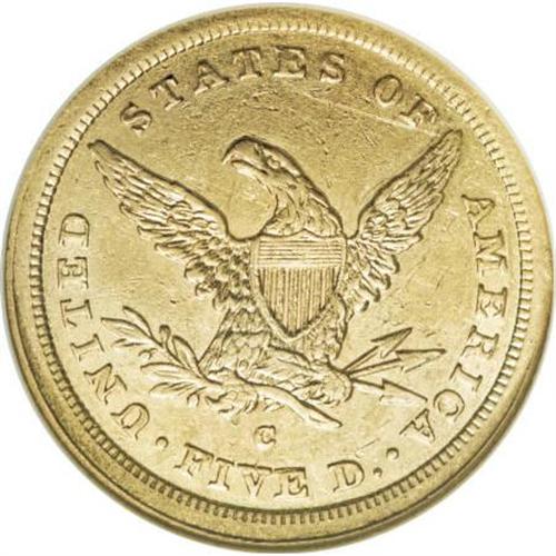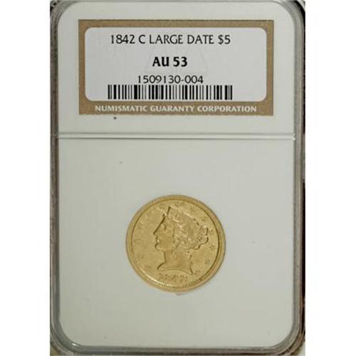 <B>1842-C $5 Large Date AU53 NGC.</B></I> Variety 5-C. An unblemished and subdued green-gold Charlotte five. An attentive strike with only minor blending of detail on Liberty's curls. Traces of luster peer from selected areas. Large and Small Date varieties subdivide the already small mintage of 27,432 pieces.<BR><I>From The Waxhaw Collection.</B></I><BR><BR><B>Coin Engraver:</B> Christian Gobrecht<BR><BR><b>Shipping:</b> Coins & Currency (<a target="_blank" href="http://www.heritageauctions.com/common/shipping.php">view shipping information</a>)