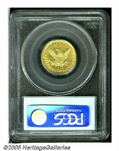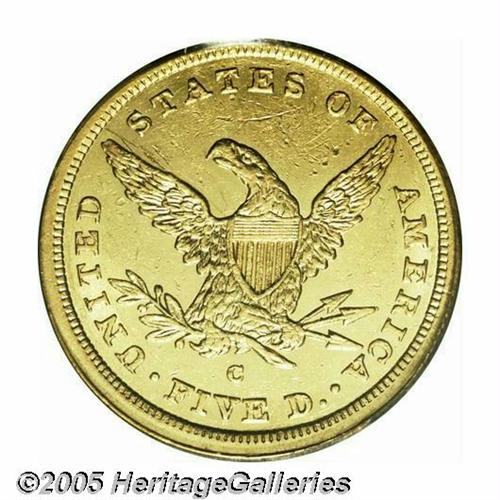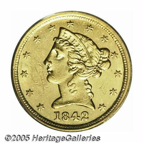 <B>1842-C<$5> Large Date AU55 PCGS.</B></I> Variety 4-C. A scant production of 27,432 pieces is divided between Large and Small Date varieties, the latter are more difficult to obtain. This well struck Charlotte Mint Five has pleasing bright luster and the initial look of a higher grade. A pinscratch concealed above the left (facing) wing prevents an AU58 designation.<BR><I>From the Dr. Kurt Peters Collection.</B></I> From the Dr. Kurt Peters Collection.
